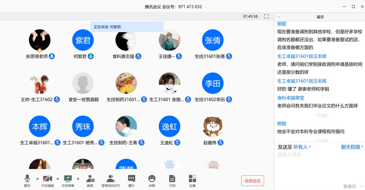 15级生物技术专业学生,现就读于武汉大学遗传学的何紫君学姐,依次为同学们分享自己的考研经验。三位同学结合自身经历从如何搜集复试信息、什么情况下考虑调剂以及复试中的专业课笔试、实验操作、英语听力与口语和专业面试如何准备等多个方面分别进行了详尽的讲解。接着谢书记提醒同学们要做好线上复试的硬件设施和软实力的准备,并且要注意防诈骗;杜院长则是从导师的角度出发提醒同学们复试面试时不要紧张、不要犯低级错误,要注意面试礼仪和精神面貌、要突出重点和个人优点。最后,同学们针对目前还存在的关于考研的疑问进行了提问,比如:调剂复试时间和原专业复试时间是否一致?初试成绩占总成绩的比例?如何在面试中做一个好的自我介绍?等等,学长学姐和老师们都一一予以了耐心的解答。