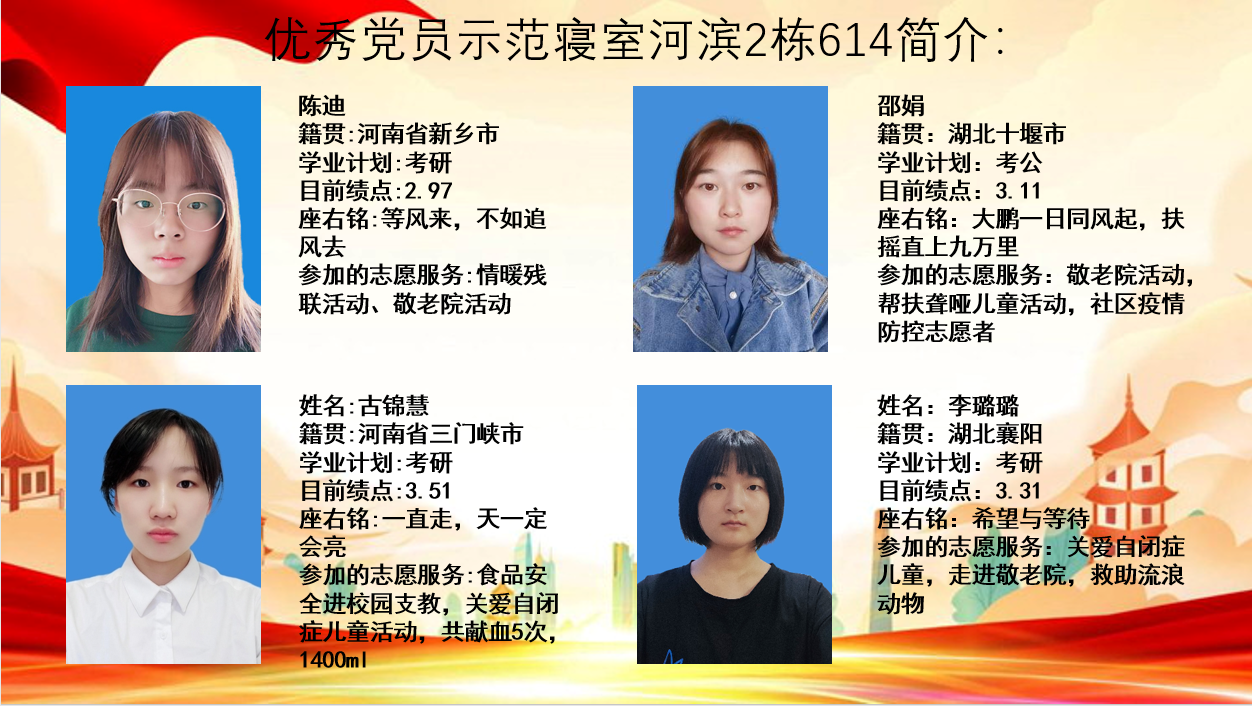 本科生第二党支部党员古锦慧所在寝室河滨公寓2-614被评选为“党员示范寝室”。该寝室目前共产党员一名,发展对象一名,积极分子两名。