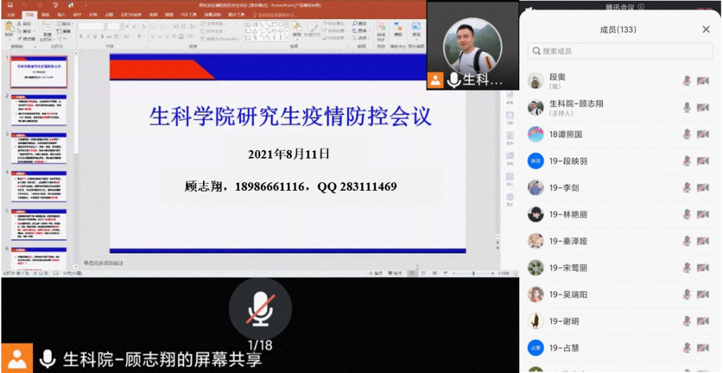 (通讯员:顾志翔、段奥、方晨昊)8月11日上午10时20分,生科学院线上开展研究生疫情防控会议。党委副书记汪萍及全院140名研究生参加。研究生辅导员顾志翔主持会议。