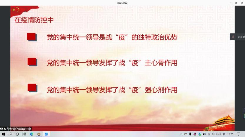 二号学习小组成员为:谭玉梅、白寅霜、何俊叶、徐梦婷,该组以“坚持党的集中统一领导的制度优势”为主题通过列举2020年至今疫情防控阻击战的胜利等实例说明坚持党的集中统一领导的优势和必要性,从而引出中国共产党领导是中国特色社会主义最本质的特征,是中国特色社会主义制度的最大优势这一事实。
