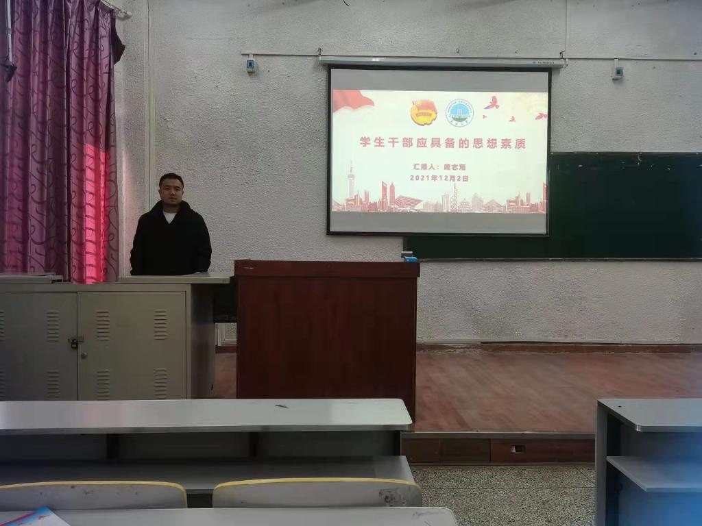 团委书记顾志翔以《学生干部思想素质培训》为主题夯实了学生们的思想素质基础。顾志翔老师从思想政治素质、道德素质、文化素质、心里素质四个方面出发,引导学生干部们确立坚定的理想信念,形成良好的思想政治素质,用科学的、正确的立场,观点和方法去分析问题,解决问题,善于冷静地分析、研究并解决学习生活中存在的各种思想问题。他表示学生组织是学生服务机构,一定要发挥好学生干部的表率作用,无论是从言论、目的性等方面都要树立良好的奉献意识,才能更好的服务同学。顾志翔老师的讲座充满激情,内容深刻,话语通俗易懂,逻辑严谨,讲座收到了很好的教育效果。最后以习近平主席对青年的寄语为结语,表达了对学生干部未来的期望。