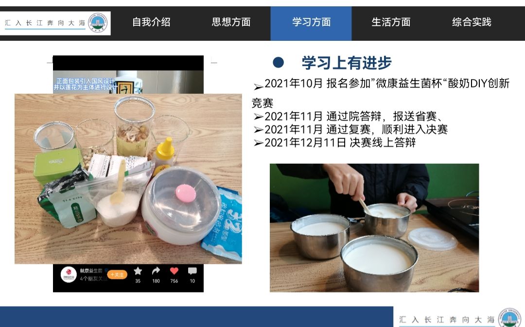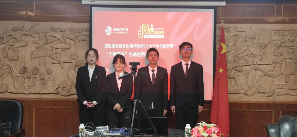 在内的13所高校,决赛采用PPT展演+评委点评互动的形式,评选出一等奖1名、二等奖3名、三等奖5名。其中,我院“千莲茶香”团队从摘要、原辅料及生产过程、营养价值、包装设计及创新点四个部分进行了精彩的答辩,在保证营养和口感的前提下,研制出一款内包装创新的茶香型酸奶。在13所高校、22个作品中成功脱颖而出,取得较好的成绩。