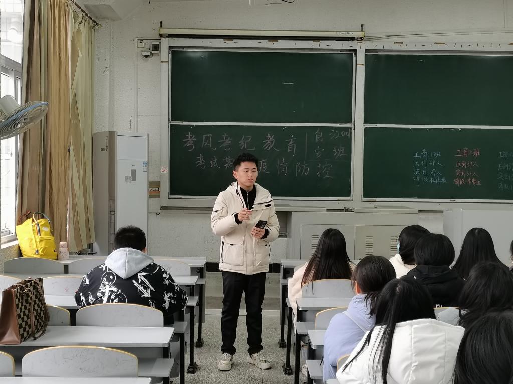 临近大学英语四六级和期末考试,各班班长首先向同学们讲解英语四六级考试的考试时间、考试地点、考试必带品及考试中的规则,同时向同学们宣读了考试纪律参考条目与违纪处理办法,并对此进行了详细解读,告诉同学们应该树立诚信意识,诚信考试,诚实做人。除此之外,班长向大家说明了考试作弊的严重性,强调树立道德之新风,立诚信之根基是当代大学生义不容辞的责任。最后,班长希望同学们树立信心、沉着应考,在复习的同时注意疫情防控问题,预祝大家在四六级考试以及期末考试中取得优异成绩。