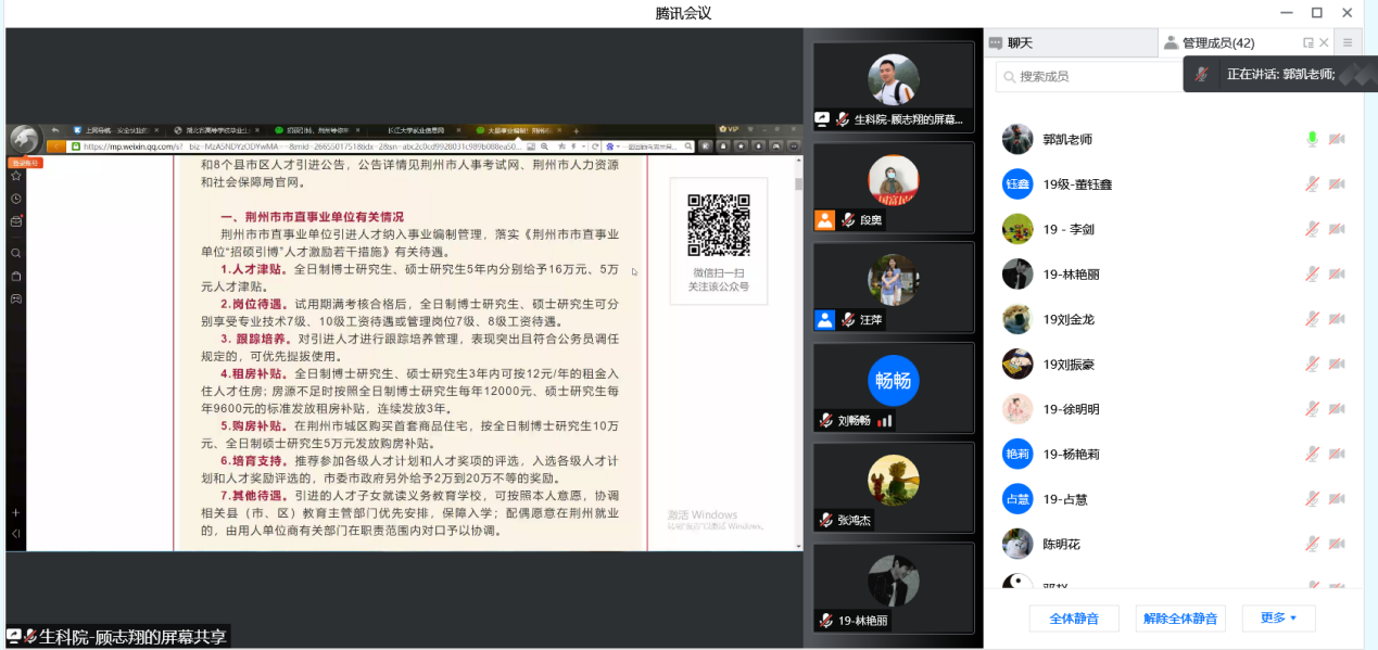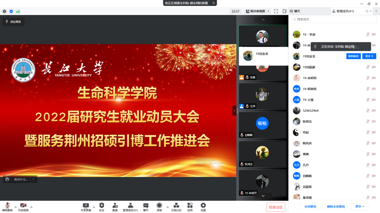服务荆州招硕引博工作推进会相关精神,进一步优化生命科学院2022届研究生的就业服务及管理工作,促进高质量就业氛围的形成。我院于2022年2月24日下午顺利召开2022届研究生就业动员暨服务荆州招硕引博工作推进会议。根据疫情防控政策要求,本次会议采用腾讯会议方式线上召开。会议由党委副书记汪萍主持,研究生辅导员顾志翔,就业专干郭凯进行宣讲,全体2019级研究生参加。