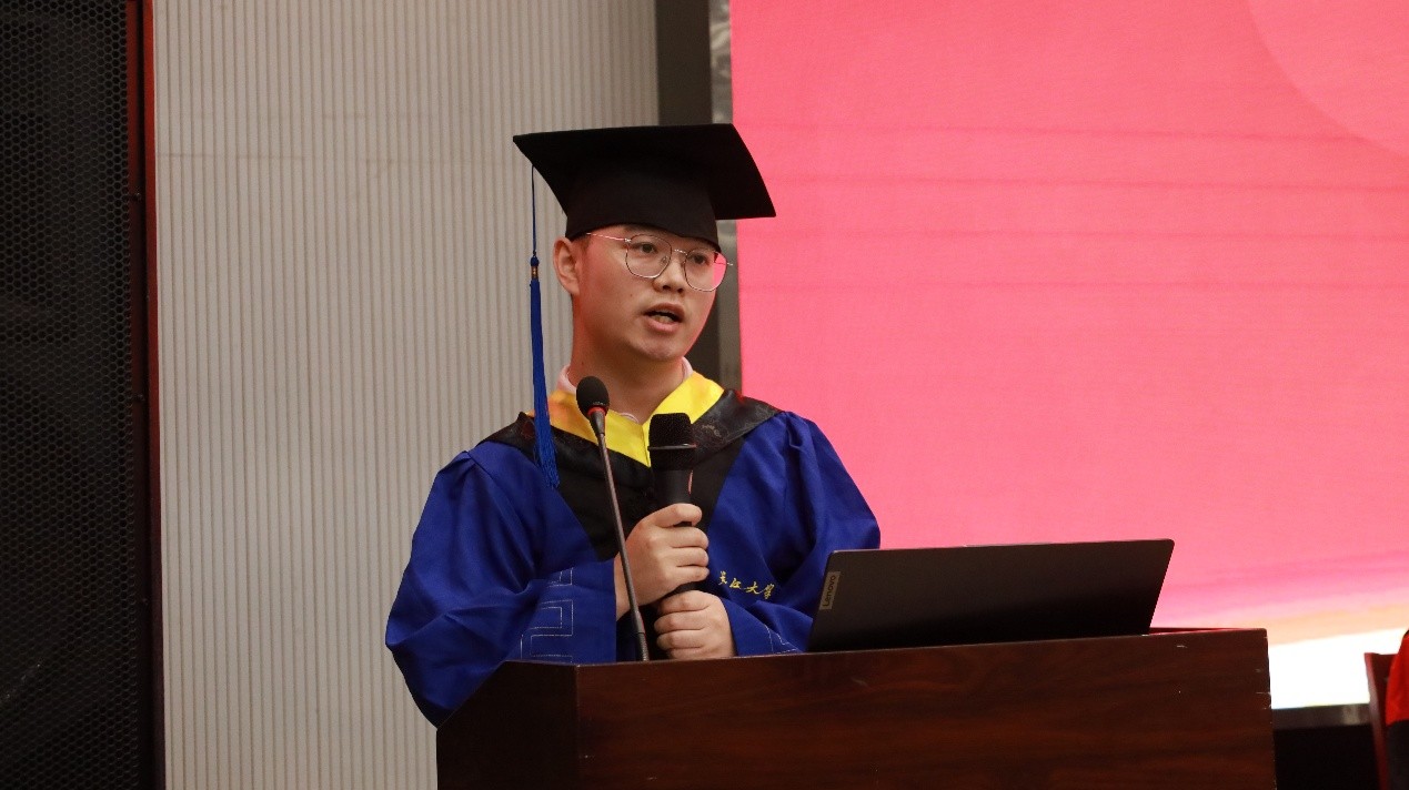 研究生毕业生代表杨坤与大家分享了自己在研究生期间的体会和感受,号召大家以坚定远大的理想励志前行,同时也祝愿了同学们鹏程万里、前程似锦。