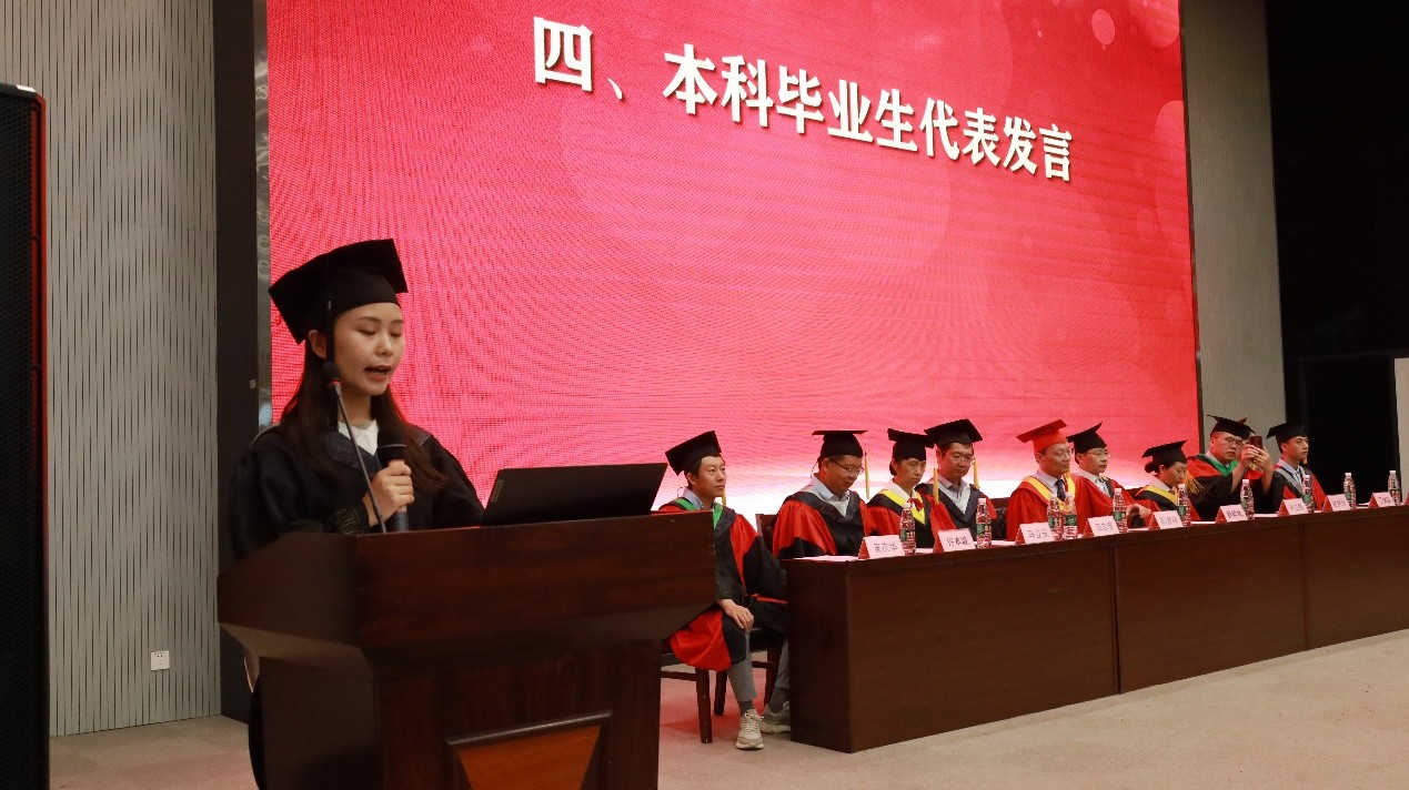 本科毕业生代表王梅同学回忆了自己长大校园留下的点点滴滴,表达了对母校的眷恋之情,对学院所有曾经陪伴大家成长的老师们表达了诚挚的感恩,对同窗的同学们表达了美好的祝福。