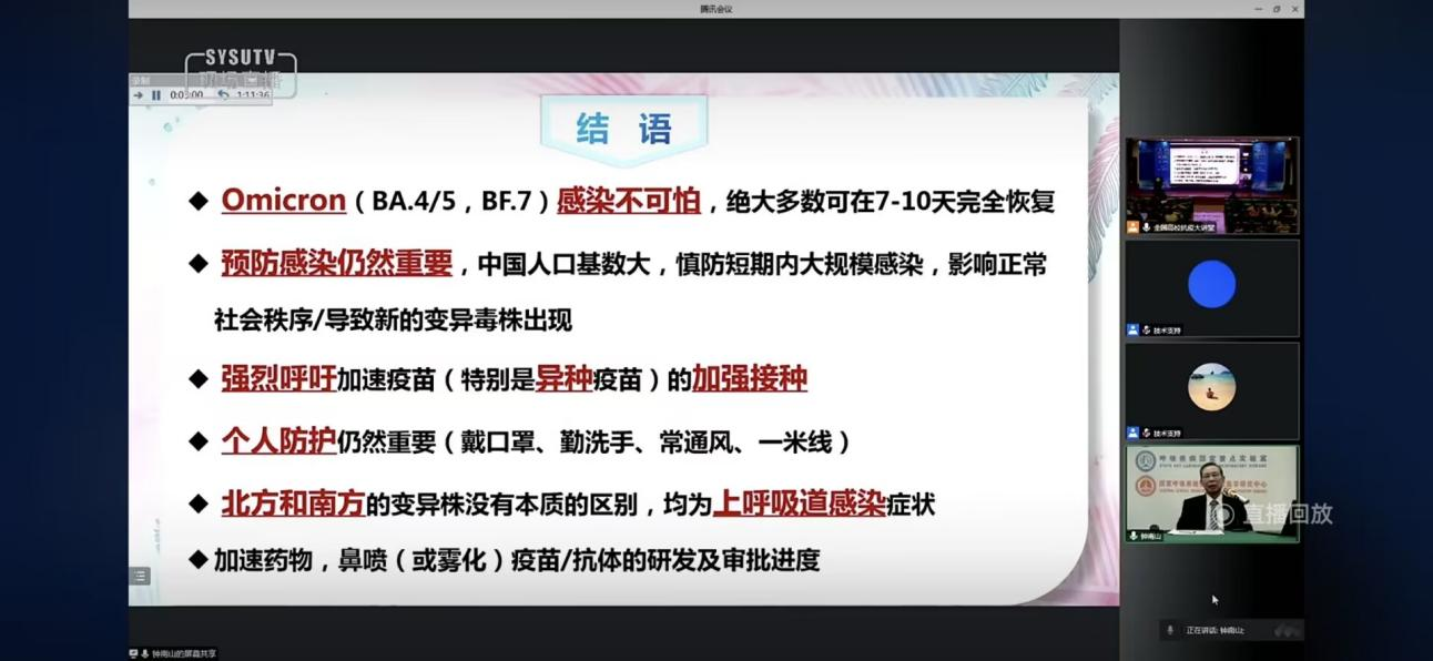 在本次讲座上钟南山院士首先总结了我们两年来艰苦抗疫所取得的伟大成就,接着从生物学特征、病毒致病性等方面介绍了奥密克戎的特点。他还提出了8条个人防护建议,即加强防护(戴口罩、保持距离、减少公众聚集等);不应为感染而害怕;大多数感染者不需要去医院;居家注意常做抗原检测;若持续发热一定要去医院;患一般慢性病老年人也要打疫苗;囤药没有太大必要;“老药新用”要经严格实验。提醒大学生“要保护好自己”。
