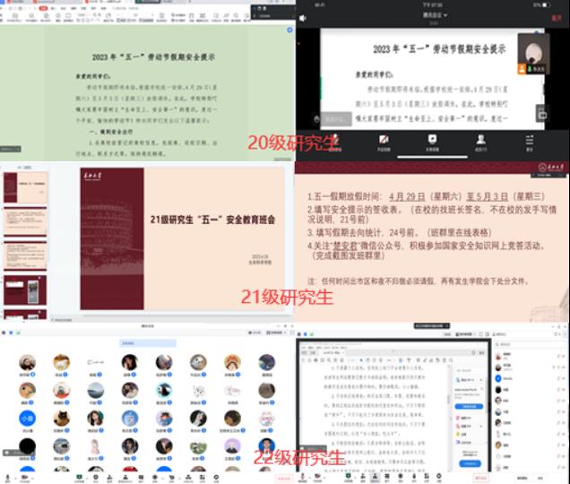 (通讯员 李凌丹 段奥)临近“五一”佳节,又逢我国第八个“全民国家安全教育日”,为进一步提升广大学生国家安全意识,营造维护国家安全和社会安全的良好氛围,确保全体研究生能够安全度过假期,学院组织研究生各班陆续召开安全主题班会。