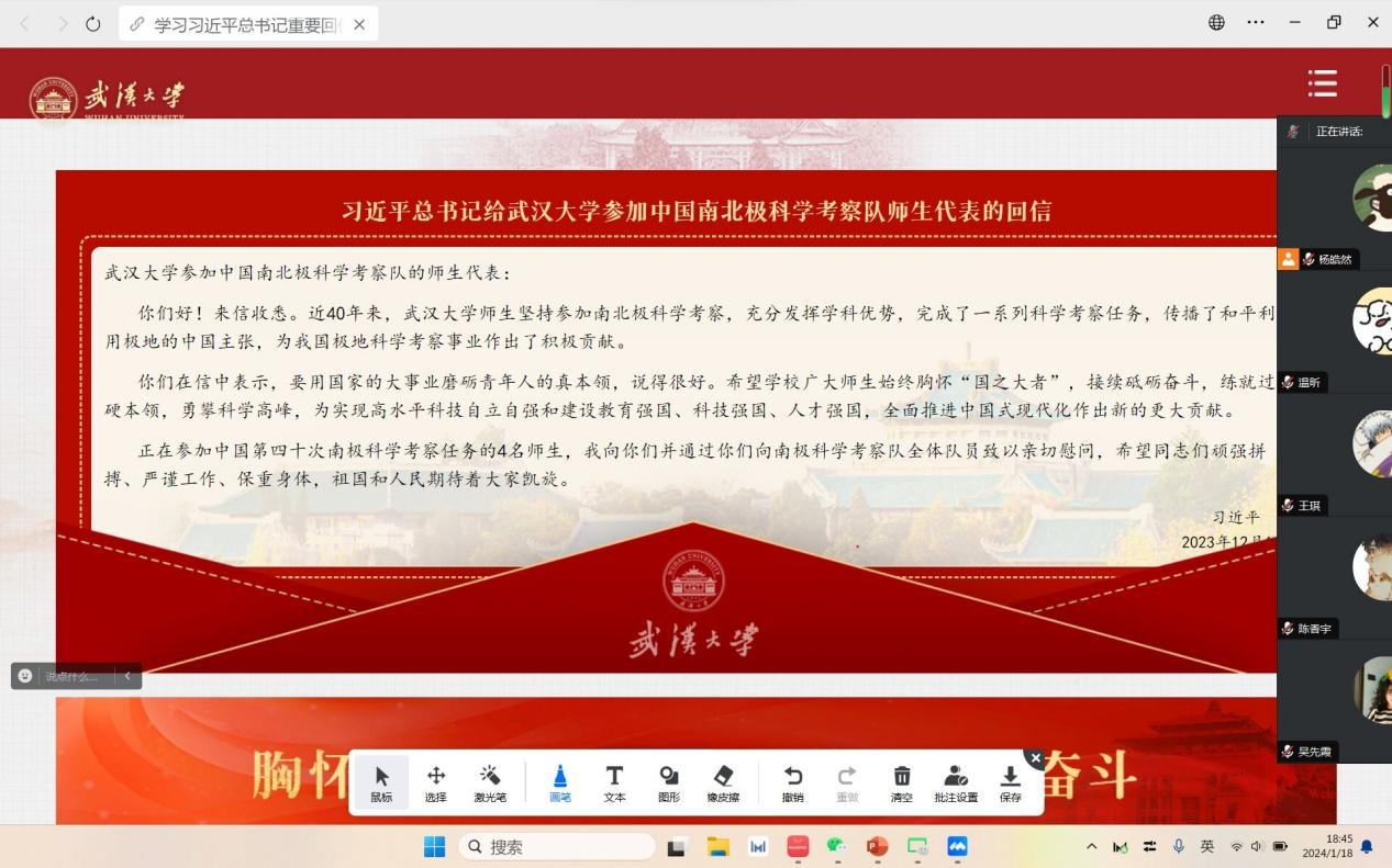 习近平总书记给武汉大学参加中国南北极科学考察队师生代表的回信,为高校发展指明了方向,也为广大学子注入精神力量,鼓励大家为实现高水平科技自立自强和建设教育强国作出新的贡献。