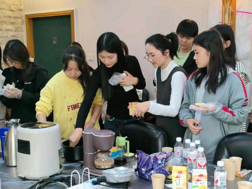 美食制作过程中,活动现场也穿插开展有趣的互动小游戏,播放了心理知识科普小视频,这使现场更加有味、有趣、有乐、有益。最后,朱老师总结讲话中提到:希望同学们做快乐的学习者,做情绪的管理者,做会求助的智慧者。