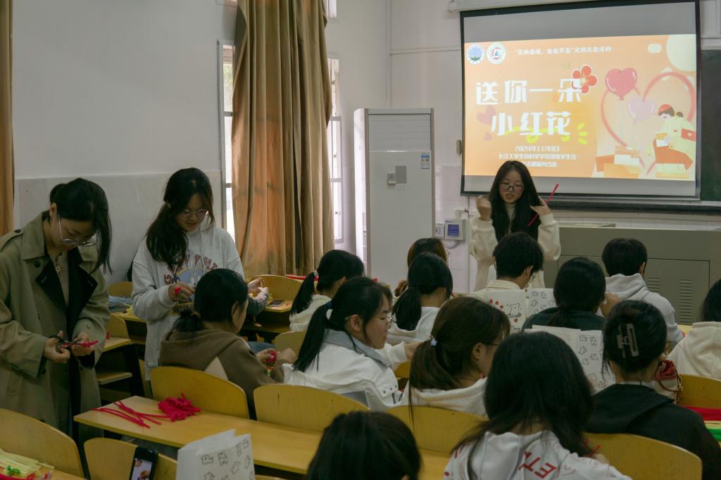在2教108室开展了一场别开生面的手工制作志愿活动——“送你一朵小红花”。此次活动由色情动漫