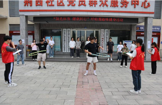 活动开始时,志愿者们在荆西社区前分成三组与荆西社区工作人员和居民一起进行跳绳、扭呼啦圈等趣味运动运动,一起体会健康运动带来的快乐。同时两名志愿者在运动过程中认真计分和确保活动安全。活动过程中每个人的脸上都洋溢着笑容。运动虽累,但乐便在其中,健康的秘诀便在其中。