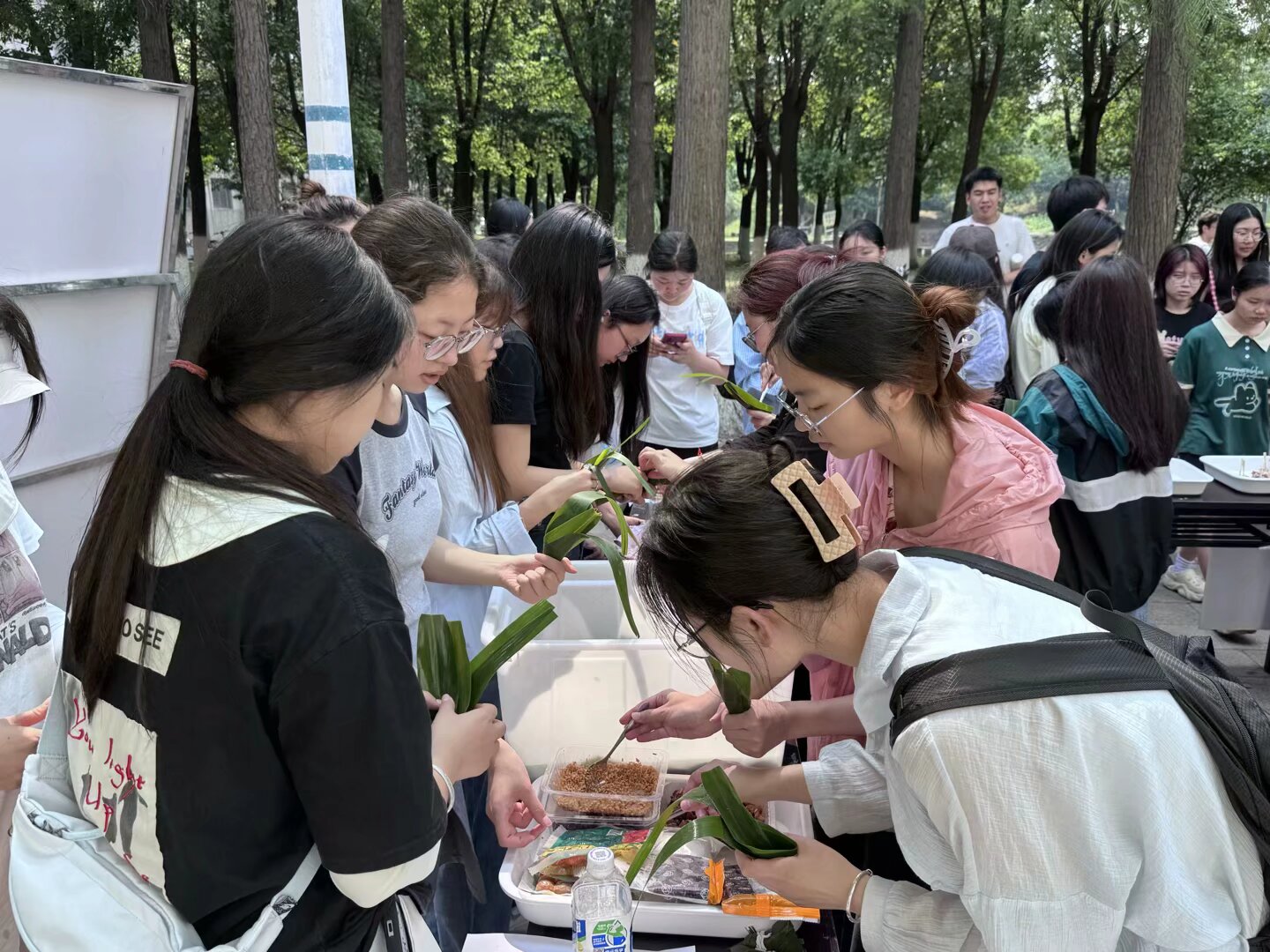 最热闹的当属互动体验区。粽叶、彩绳、糯米、红豆、蛋黄等食材一应俱全,有序陈列。同学们争相体验,撸起袖子用心包,很多人都是第一次包粽子。“看起来简单,实则困难,真是‘一看就会,一学就废’。”一位体验者笑着表示。不到半小时,体验区就生成了近百个各具特色的粽子,等候下锅。