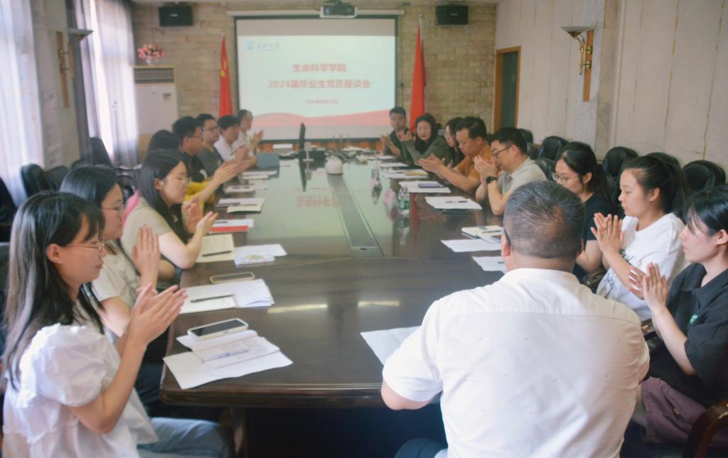 在行政楼323会议召开2024届毕业生党员座谈会。党委书记谢作喜、党委副书记万波、辅导员贾雨濛与毕业生代表共抒情谊、共话成长、共谈未来。