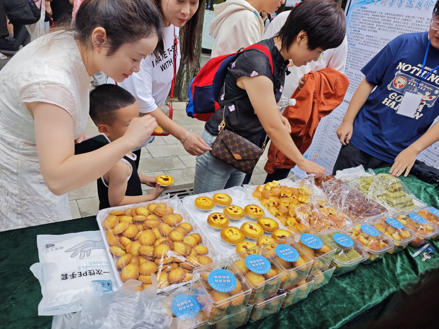 食光美好,青春热烈。学院设立迎新美食小摊,陈列着学院师生一起制作的蛋挞、巧克力饼干、曲奇、绿豆糕等甜点,供广大新生和家长品尝,表达对新生的热烈欢迎。色香味俱全的甜品让新生与家长赞不绝口,志愿者的热情介绍更是让学院的专业魅力深入人心。