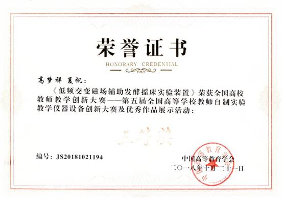 (通讯员 孙恺)10月21日,由中国高等教育学会主办的中国高等教育博览会在成都落幕,在“全国高校教师教学创新大赛——第五届全国高等学校教师自制实验教学仪器设备创新大赛及优秀作品展示”活动中,我院高梦祥教授、夏帆高级工程师的参赛作品的《低频交变磁场辅助发酵摇床实验装置》喜获三等奖。