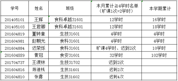 课堂考勤实施办法》,经学工办研究决定,对本月累计旷课4学时以上,迟到2次及以上的同学予以通报批评: